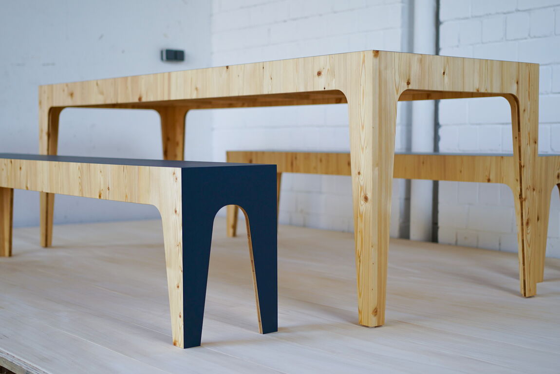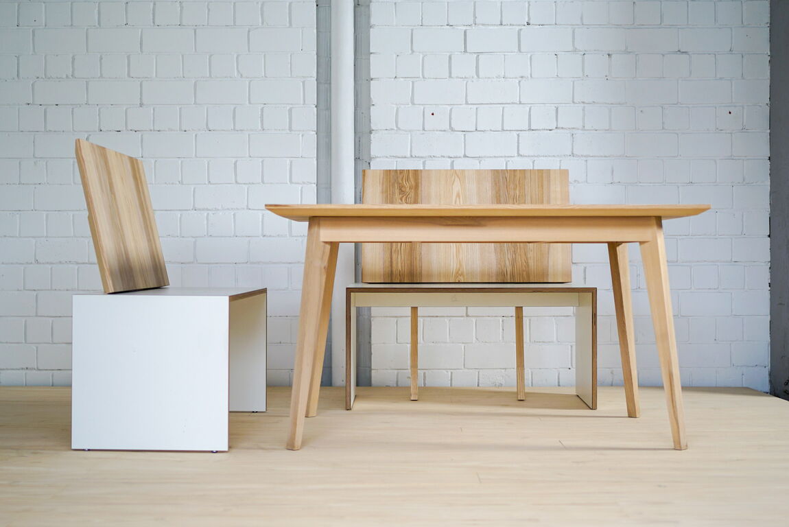 Tisch Esche kernig geseift, Bänke in Multiplex mit HPL belegt